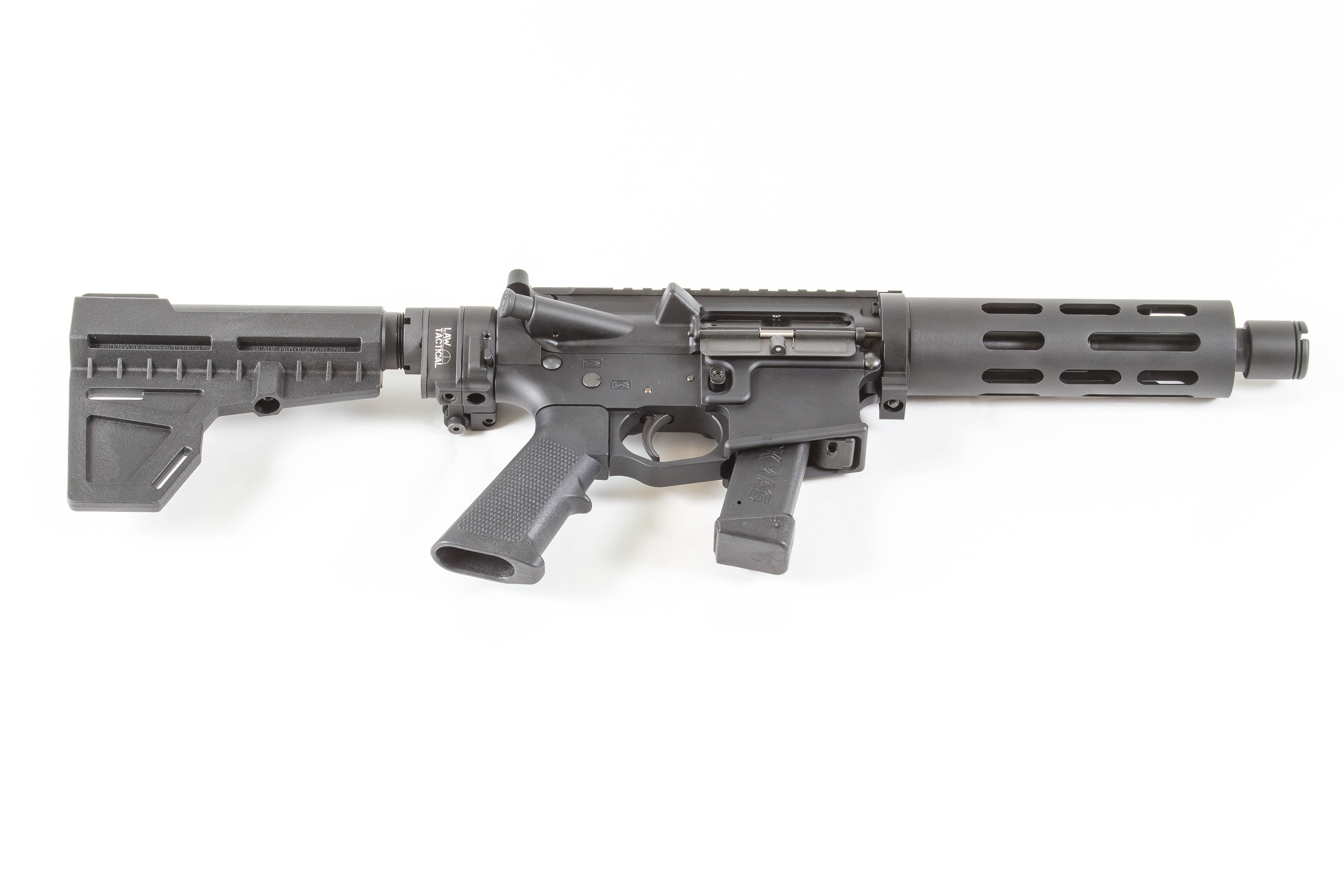 BRACE – Shockwave Blade mounted on a dimpled pistol buffer tube.